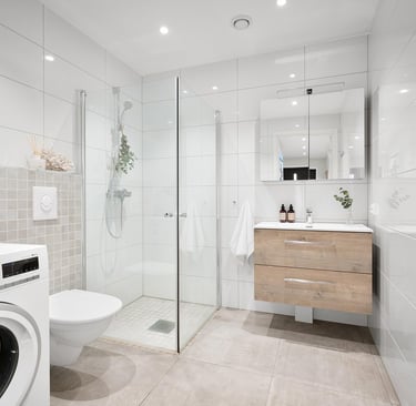 Showers, tubs, vanities, waterproofing, tile, and ventilation upgrades.